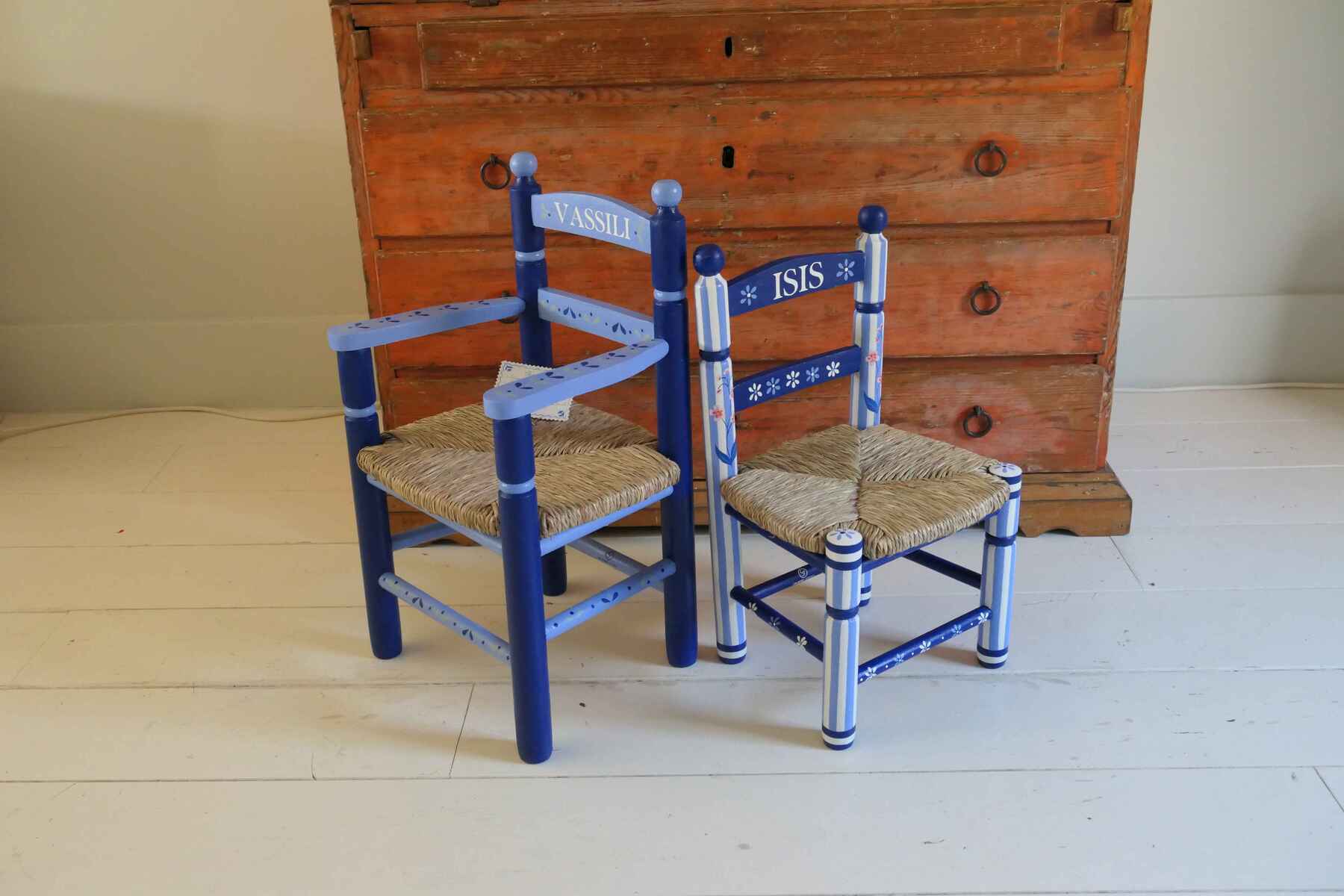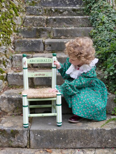 Assise en paille d'une petite chaise enfant en bois peinte à la main dans les tons verts | © Colombe Steisel